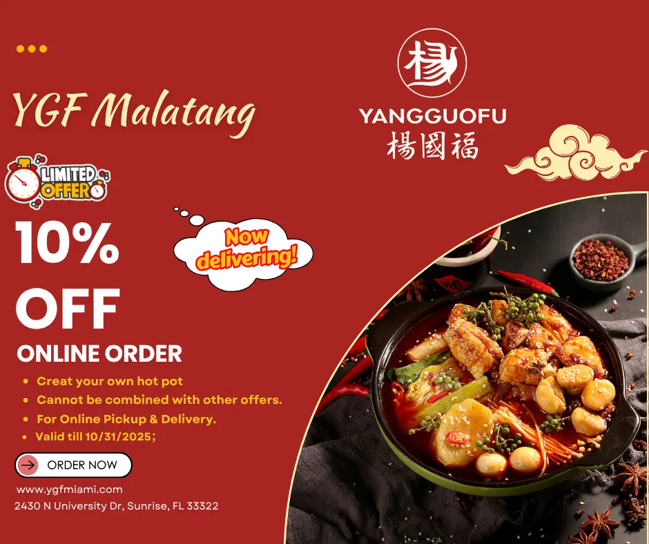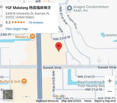 YGF Malatang offers a vibrant and authentic Chinese Malatang dining experience, now bringing the beloved Malatang street food to the Sunrise Miami Area at 2430 N University Dr, Sunrise, FL 33322. We specialize in an interactive culinary adventure where you create your own bowl by selecting from a wide variety of fresh ingredients, including vegetables, meats, seafood, and tofu. Your personalized choices are then expertly cooked in our rich and aromatic broth, seasoned with a masterful blend of spices and herbs. Best of all, you have full control to tailor the spice level and flavor to your exact preference, making it a perfect destination for both spice enthusiasts and those eager to explore the bold flavors of authentic Malatang.